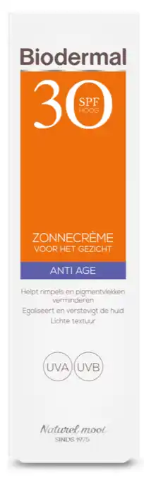 Nu in de aanbieding bij De Online Drogist: Biodermal SPF30 Anti Age Zonnecrème Gezicht 40ML✅ Actie geldig van 28-04 t/m 5-05.