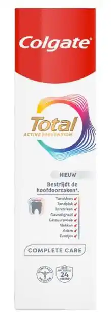 De Online Drogist biedt naast de Colgate Total Complete Care Tandpasta 75ML een ruime collectie producten aan. Houd de wekelijkse De Online Drogist folder in de gaten om de beste aanbiedingen en acties te vinden. Naast Colgate Total Complete Care Tandpasta 75ML, kunt u ook de volgende aanbiedingen vinden: Colgate Total active prevention complete care, Colgate Tandpasta total original & Colgate Total Natural White Tandpasta.