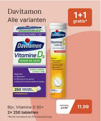 Davitamon Alle varianten VANAF 50 JAAR is een hoog gedoseerd vitamine D3 supplement met extra energie bij vermoeidheid. Deze tabletten met citroensmaak ondersteunen de weerstand, werking van de spieren en het behoud van sterke botten en tanden. Daarnaast bevatten ze zink en selenium voor een optimale ondersteuning van het immuunsysteem. Dankzij de flexibele dosering van 2,5 mcg = 100IE per dag zijn ze gemakkelijk in te nemen. Met 15 bruistabletten per verpakking is dit product ideaal voor dagelijks gebruik. Profiteer nu van de 1+1 gratis actie, waarbij de adviesprijs van 23,98 wordt verrekend als 50% kassakorting, waardoor je slechts 11,99 betaalt voor 2× 250 tabletten.