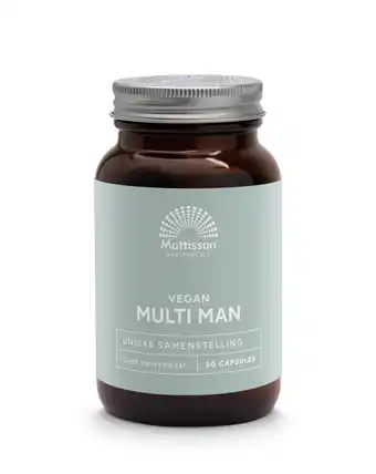 Nu in de aanbieding bij De Online Drogist: Mattisson HealthStyle Vegan Multi Man Capsules✅ Actie geldig van 24-05 t/m 24-04.