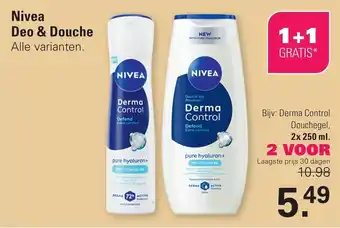 Ontdek de nieuwe Nivea Deo & Douche met pure hyaluron en Pro-Vitamine B5. Kies uit alle varianten zoals Derma Control, Defend Extra comfort en DERMA 72h ACTIVE. Profiteer nu van de actie: 1+1 GRATIS*! Deze douchegel reinigt de huid op milde wijze en zorgt voor een langdurige frisheid. De formule met pure hyaluron hydrateert de huid intensief en Pro-Vitamine B5 verzorgt en beschermt. Geniet van een heerlijke douche-ervaring en een langdurige bescherming tegen transpiratie met de Nivea Deo & Douche. Bestel nu jouw favoriete varianten voor de laagste prijs van 10.98 voor 5.49. Profiteer van deze aanbieding en ervaar het extra comfort van Nivea!