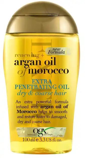 Nu in de aanbieding bij De Online Drogist: Ogx renewing moroccan argan oil extra strenght 100ml✅ Actie geldig van 19-02 t/m 26-02.