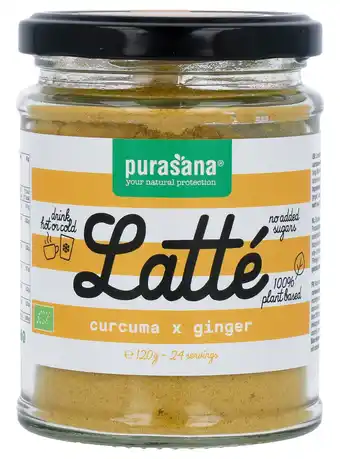 Nu in de aanbieding bij De Online Drogist: Purasana latté curcuma & ginger 120gr✅ Actie geldig van 22-04 t/m 21-04.