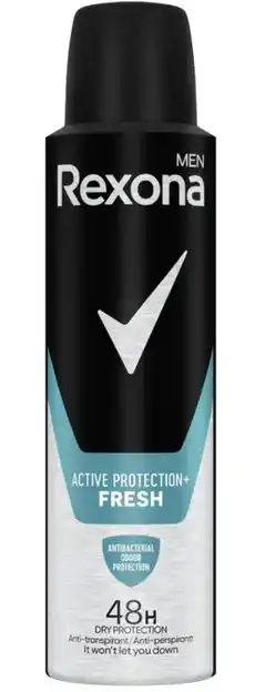 Nu in de aanbieding bij De Online Drogist: Rexona Men Active Protection+ Fresh Deospray 150ML✅ Actie geldig van 19-02 t/m 25-02.