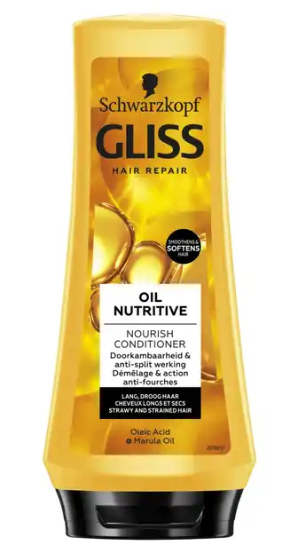 Nu in de aanbieding bij De Online Drogist: Schwarzkopf gliss kur oil nutritive nourish conditioner 200ml✅ Actie geldig van 14-11 t/m 9-01.