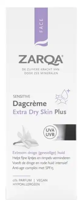 Nu in de aanbieding bij De Online Drogist: Zarqa Sensitive Dagcrème Extra-Dry Skin Plus 0% Parfum SPF15✅ Actie geldig van 19-02 t/m 26-02.