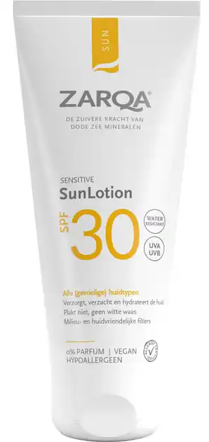 Zarqa Sensitive SunLotion SPF30 aanbieding en online acties bij De Online Drogist