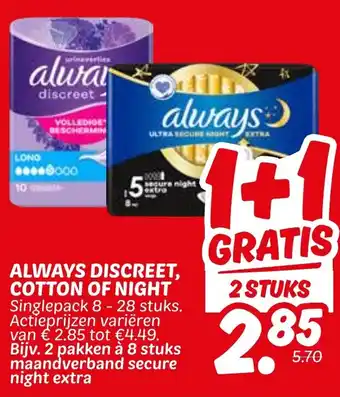 De prijs van de Always discreet, cotton of night kan ook teruggevonden worden hierboven op de pagina, samen met de datum van wanneer de aanbieding beschikbaar is. Ook kun je de prijzen in de huidige Dekamarkt folder of op de Dekamarkt website controleren. De aanbiedingen verzekeren je van het kopen van de Dekamarkt producten voor de laagste prijs.
