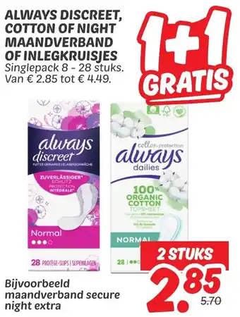 Always discreet, cotton of night maandverband of inlegkruisjes korting bij Dekamarkt
