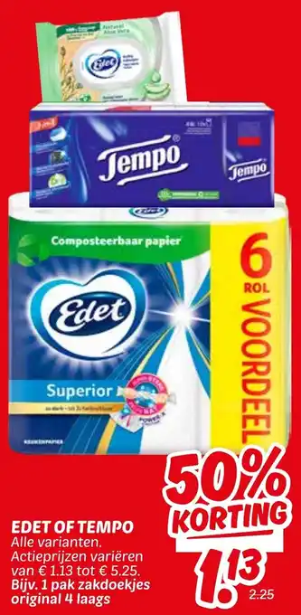 Kies uit de verschillende varianten van Edet of Tempo, zoals Jempo, Tempo, Composteerbaar papier, 6, Edet, Superior, POWER, ROL, O VOORDEEL. Profiteer van actieprijzen variërend van € 1.13 tot € 5.25. Bijvoorbeeld, krijg 50% korting op 1 pak zakdoekjes original 4 laags, voor slechts € 2.25. Deze producten bieden superieure absorptie en krachtige reiniging, waardoor ze ideaal zijn voor dagelijks gebruik. Het composteerbare papier zorgt ervoor dat je ook nog eens milieubewust bezig bent. Of je nu op zoek bent naar toiletpapier, zakdoekjes of keukenrollen, Edet of Tempo heeft de perfecte oplossing voor jouw behoeften. Bestel nu en geniet van de kwaliteit en het gemak van Edet of Tempo.