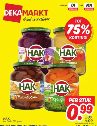 Dekamarkt biedt naast de Hak een ruime collectie producten aan. Houd de wekelijkse Dekamarkt folder in de gaten om de beste aanbiedingen en acties te vinden. Naast Hak, kunt u ook de volgende aanbiedingen vinden: Hak Rabarbercompote, Hak Tuinboontjes & Hak Kapucijners.