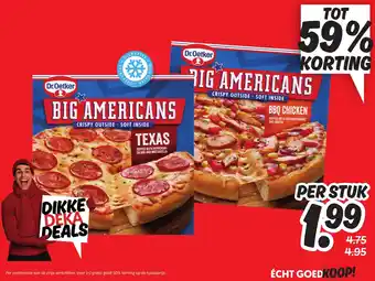 Geniet van de heerlijke Rig Americans, met een krokante buitenkant en zachte binnenkant. Deze diepvriespizza's zijn belegd met BBQ chicken, chicken breast en kaas. Nu verkrijgbaar voor slechts €4.75 per stuk. Profiteer van de dikke deals en ontvang tot wel 59% korting op de totaalprijs. Voor de 1+1 gratis actie geldt 50% korting op de totaalprijs. Haal nu jouw Big Americans Texas pizza's van Dr. Oetker in huis en geniet van echt goedkoop en smaakvol eten. Deze aanbieding is geldig zolang de voorraad strekt, dus wacht niet te lang en bestel vandaag nog jouw Rig Americans. Eet smakelijk!