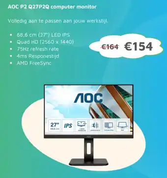 De AOC P2 Q27P2Q computer monitor is momenteel met korting verkrijgbaar bij Digitotaal. Hier vind je alle details over prijs, geldigheidsduur en actievoorwaarden. Vergeet niet om ook andere aanbiedingen en deals voor AOC P2 Q27P2Q computer monitor te bekijken zodat je zeker weet dat je de beste prijs betaalt. De kortingsactie loopt van 19-01-2026 tot 01-02-2026. Is de actie inmiddels verlopen? Geen zorgen, vergelijk dan soortgelijke aanbiedingen of volg de productcategorie voor toekomstige prijsverlagingen. Zo koop je altijd met voordeel.Veelgestelde vragen over AOC P2 Q27P2Q computer monitor
