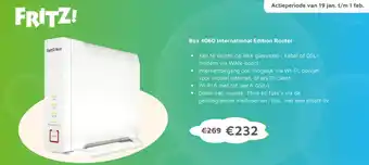 De prijs van de Box 4060 International Edition Router kan ook teruggevonden worden hierboven op de pagina, samen met de datum van wanneer de aanbieding beschikbaar is. Ook kun je de prijzen in de huidige Digitotaal folder of op de Digitotaal website controleren. De aanbiedingen verzekeren je van het kopen van de Digitotaal producten voor de laagste prijs.