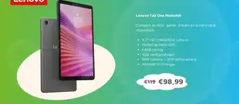 Deze Lenovo Tab One Mediatek is nu in de aanbieding bij Digitotaal. Bekijk ook andere lopende acties en bespaar met scherpe prijzen of online deals. Bestel Lenovo Tab One Mediatek via Digitotaal website of koop het product met korting in een winkel bij jou in de buurt. Op Folderz.nl verzamelen we dagelijks de beste Lenovo Tab One Mediatek aanbiedingen. Klik op het belletje om een gratis melding te ontvangen zodra er weer een nieuwe actie of prijsverlaging voor Lenovo Tab One Mediatek beschikbaar is.Veelgestelde vragen over Lenovo Tab One Mediatek