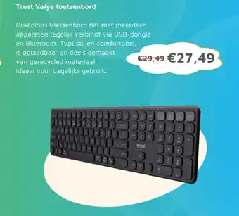De aanbieding is verkrijgbaar in verschillende winkels, bekijk alle producten om de goedkoopste Trust Vaiya toetsenbord te krijgen. Als je graag wilt kijken of het artikel met meer korting te koop is in een andere winkel, bekijk de categorie 'Computer'. Wellicht vind je deze aanbiedingen ook interessant: Trust Trezo toetsenbord & muisset, Trust TKM 360 toetsenbord & muisset & Trust GXT 871 Zora Mechanisch Gaming Toetsenbord Qwerty.