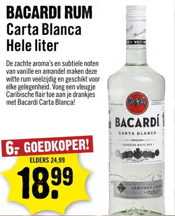 De prijs van de Bacardi Rum Carta Blanca kan ook teruggevonden worden hierboven op de pagina, samen met de datum van wanneer de aanbieding beschikbaar is. Ook kun je de prijzen in de huidige Dirck 3 folder of op de Dirck 3 website controleren. De aanbiedingen verzekeren je van het kopen van de Dirck 3 producten voor de laagste prijs.