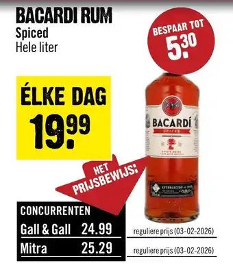 De prijs van de Bacardi rum spiced hele liter kan ook teruggevonden worden hierboven op de pagina, samen met de datum van wanneer de aanbieding beschikbaar is. Ook kun je de prijzen in de huidige Dirck 3 folder of op de Dirck 3 website controleren. De aanbiedingen verzekeren je van het kopen van de Dirck 3 producten voor de laagste prijs.