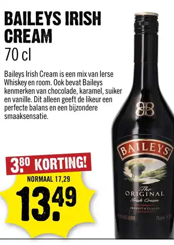 Baileys Irish Cream is een mix van Ierse Whiskey en room, met kenmerken van chocolade, karamel, suiker en vanille. Deze likeur biedt een perfecte balans en een bijzondere smaaksensatie. Het product is afkomstig uit Ierland en wordt nu tijdelijk aangeboden met een korting van 3,80 euro. Normaal kost het 17,29 euro, maar nu slechts 13,49 euro. Geniet van de heerlijke smaak van Baileys Irish Cream, een klassieker die niet mag ontbreken in je drankenkast. Probeer het zelf en ontdek waarom Baileys al jarenlang geliefd is bij vele liefhebbers van likeur. Bestel nu en geniet van deze unieke drankervaring!