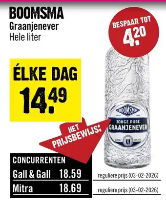 De prijs van de Boomsma graanjenever kan ook teruggevonden worden hierboven op de pagina, samen met de datum van wanneer de aanbieding beschikbaar is. Ook kun je de prijzen in de huidige Dirck 3 folder of op de Dirck 3 website controleren. De aanbiedingen verzekeren je van het kopen van de Dirck 3 producten voor de laagste prijs.