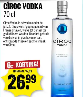 De prijs van de Ciroc Vodka 70 cl kan ook teruggevonden worden hierboven op de pagina, samen met de datum van wanneer de aanbieding beschikbaar is. Ook kun je de prijzen in de huidige Dirck 3 folder of op de Dirck 3 website controleren. De aanbiedingen verzekeren je van het kopen van de Dirck 3 producten voor de laagste prijs.