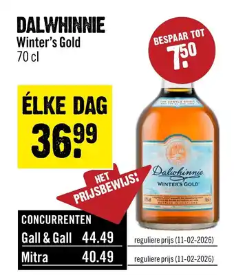 Dalwhinnie Winter's Gold is een heerlijke whisky van 70 cl die normaal gesproken €44.49 kost bij Gall & Gall. Met het prijsbewijs van €40.49 op 11-02-2026 bespaar je tot wel €7.50 ten opzichte van de reguliere prijs. Dalwhinnie Winter's Gold staat bekend om zijn zachte en zoete smaak met tonen van honing en vanille. Het is de perfecte drank om elke dag van te genieten. Concurrenten kunnen niet op tegen deze scherpe aanbieding. Mis deze kans niet om te genieten van de premium kwaliteit van Dalwhinnie voor een voordelige prijs. Bestel nu en geniet van deze heerlijke whisky!