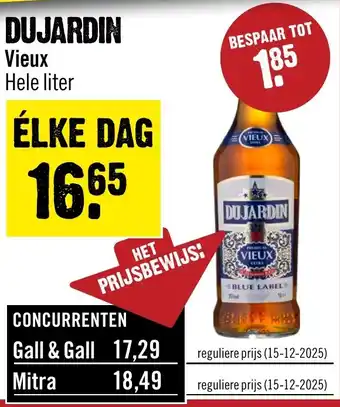 Geniet van de heerlijke smaak van Dujardin Vieux Blue Label, al sinds 1665 een begrip. Met een hele liter fles kun je elke dag genieten van deze kwaliteitsdrank. Bespaar tot wel €2,20 per fles ten opzichte van de concurrenten Gall & Gall en Mitra, die respectievelijk €17,29 en €18,49 vragen. Dit is het prijsbewijs dat je bij ons altijd voordelig uit bent. Profiteer van deze aanbieding en haal jouw Dujardin Vieux in huis voor de reguliere prijs van €15,00 op 15-12-2025. Waar wacht je nog op? Bestel nu en geniet binnenkort van deze heerlijke Vieux met een rijke geschiedenis en een voordelige prijs!