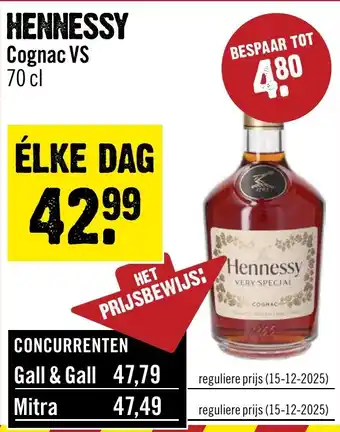 Geniet dagelijks van de heerlijke smaak van Hennessy Cognac VS 70 cl, nu voor een onverslaanbare prijs van slechts 42.99. Bespaar tot wel 7 euro in vergelijking met de reguliere prijs bij concurrenten zoals Gall & Gall en Mitra. Deze Very Special Cognac van Hennessy heeft een rijke en volle smaak met tonen van eikenhout en vanille. Met een alcoholpercentage van 40% is deze drank perfect om puur van te genieten of te mixen in cocktails. Profiteer van deze aanbieding en haal jouw fles Hennessy Cognac VS 70 cl in huis voor een scherpe prijs. Deze actieprijs geldt tot 15 december 2025, dus wacht niet te lang!