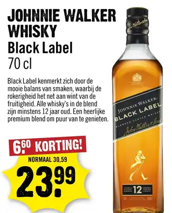 JOHNNIE WALKER WHISKY Black Label kenmerkt zich door de mooie balans van smaken, waarbij de rokerigheid het net aan wint van de fruitigheid. Alle whisky's in de blend zijn minstens 12 jaar oud. Een heerlijke, premium blend om puur van te genieten. Normaal 30,59, nu voor slechts 23.99! Deze BLENDED SCOTCH WHISKY is ND AGED 12 YEARS. Profiteer van 660 KORTING op deze klassieke whisky van Johnnie Walker. Geniet van de rijke smaken en aroma's van deze iconische drank, perfect voor speciale gelegenheden of gewoon om van te genieten na een lange dag.