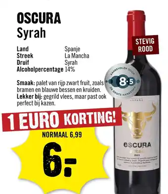 Geniet van de stevige rode OSCURA Syrah uit Spanje La Mancha. Met een alcoholpercentage van 14% en een smaakpalet van rijp zwart fruit en kruiden, zoals bramen en blauwe bessen. Deze EDICIÓN LIMITADA is een aanrader en wordt aanbevolen door Hamersma met een score van 8.5. Normaal 6,99, maar nu met 1 euro korting! Deze heerlijke rode wijn past perfect bij gegrild vlees en kazen. Mis deze kans niet en haal de OSCURA Syrah in huis voor een onvergetelijke smaakervaring. Proef de kwaliteit van de grote 2023 oogst en geniet van deze exclusieve wijn.