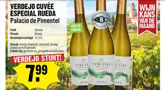 Dirck 3 biedt naast de Palacio de Pimentel Rueda Verdejo Cuvée Especial 75 cl een ruime collectie producten aan. Houd de wekelijkse Dirck 3 folder in de gaten om de beste aanbiedingen en acties te vinden. Naast Palacio de Pimentel Rueda Verdejo Cuvée Especial 75 cl, kunt u ook de volgende aanbiedingen vinden: Verdejo cuvée especial rueda palacio de pimentel, La Capilla Rueda Verdejo 75 cl & Cune Rueda Verdejo.