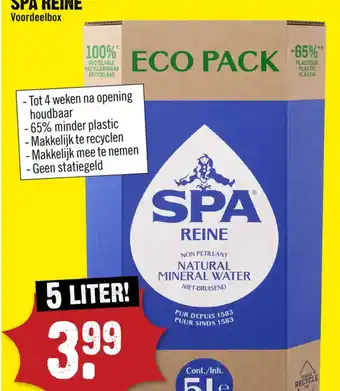 De prijs van de Spa reine kan ook teruggevonden worden hierboven op de pagina, samen met de datum van wanneer de aanbieding beschikbaar is. Ook kun je de prijzen in de huidige Dirck 3 folder of op de Dirck 3 website controleren. De aanbiedingen verzekeren je van het kopen van de Dirck 3 producten voor de laagste prijs.