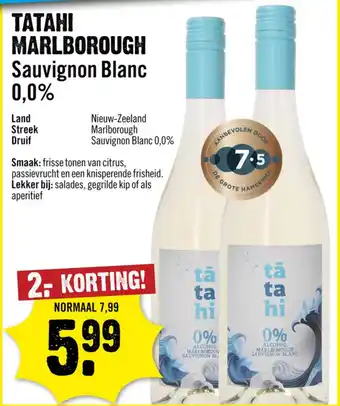 Tatahi Marlborough Sauvignon Blanc 0,0% is een verfrissende alcoholvrije wijn uit Nieuw-Zeeland. Deze wijn heeft frisse tonen van citrus, passievrucht en een knisperende frisheid. Perfect te combineren met salades, gegrilde kip of als aperitief. Normaal kost deze wijn 7.99, maar nu met 2 euro korting voor slechts 5.99. De Grote Hamersma beveelt deze wijn aan met een 7.5. Geniet van de smaak van Marlborough Sauvignon Blanc zonder alcohol. Probeer Tatahi Marlborough Sauvignon Blanc 0,0% en ontdek de heerlijke smaken van deze wijn uit Nieuw-Zeeland.