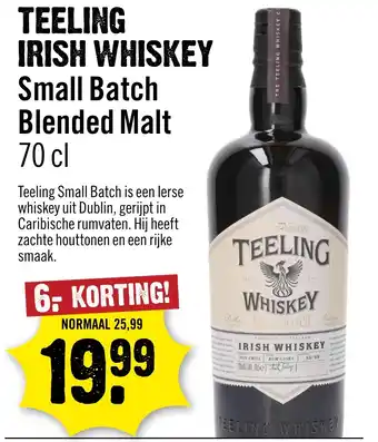 De prijs van de Teeling irish whiskey small batch blended malt kan ook teruggevonden worden hierboven op de pagina, samen met de datum van wanneer de aanbieding beschikbaar is. Ook kun je de prijzen in de huidige Dirck 3 folder of op de Dirck 3 website controleren. De aanbiedingen verzekeren je van het kopen van de Dirck 3 producten voor de laagste prijs.
