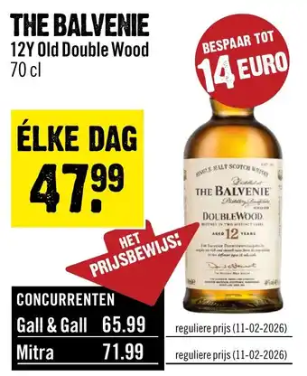 Geniet van de heerlijke smaak van The Balvenie 12Y Old Double Wood single malt Scotch whisky, nu voor slechts 47.99 bij HET PRIJSBEWIJS. Normaal gesproken betaal je 71.99, maar bij ons bespaar je tot wel 14 euro! Deze whisky is afkomstig van THE BALVENIE Distillery Bande DOUBLEWOOD en heeft een leeftijd van 12 jaar. Perfect voor elke dag genieten van een premium drankje. Vergelijk onze prijs met die van onze concurrenten zoals Gall & Gall (65.99) en Mitra. Profiteer van deze aanbieding en haal deze prachtige fles van 70 cl in huis voor een voordelige prijs. Aarzel niet, want deze actie geldt tot de reguliere prijs van 71.99 op 11-02-2026.