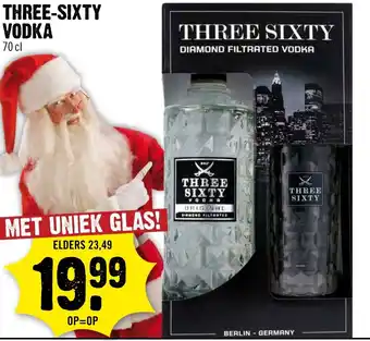 De prijs van de Three-sixty vodka kan ook teruggevonden worden hierboven op de pagina, samen met de datum van wanneer de aanbieding beschikbaar is. Ook kun je de prijzen in de huidige Dirck 3 folder of op de Dirck 3 website controleren. De aanbiedingen verzekeren je van het kopen van de Dirck 3 producten voor de laagste prijs.
