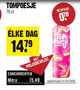 De prijs van de Tompoesje Shot 70 cl kan ook teruggevonden worden hierboven op de pagina, samen met de datum van wanneer de aanbieding beschikbaar is. Ook kun je de prijzen in de huidige Dirck 3 folder of op de Dirck 3 website controleren. De aanbiedingen verzekeren je van het kopen van de Dirck 3 producten voor de laagste prijs.