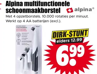 De prijs van de Alpina multifunctionele schoonmaakborstel kan ook teruggevonden worden hierboven op de pagina, samen met de datum van wanneer de aanbieding beschikbaar is. Ook kun je de prijzen in de huidige Dirk folder of op de Dirk website controleren. De aanbiedingen verzekeren je van het kopen van de Dirk producten voor de laagste prijs.