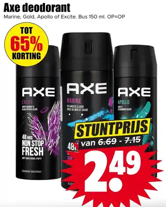 De prijs van de Axe deodorant kan ook teruggevonden worden hierboven op de pagina, samen met de datum van wanneer de aanbieding beschikbaar is. Ook kun je de prijzen in de huidige Dirk folder of op de Dirk website controleren. De aanbiedingen verzekeren je van het kopen van de Dirk producten voor de laagste prijs.
