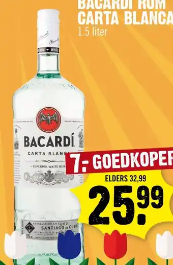 De aanbieding is verkrijgbaar in verschillende winkels, bekijk alle producten om de goedkoopste Bacardi rum carta blanca te krijgen. Als je graag wilt kijken of het artikel met meer korting te koop is in een andere winkel, bekijk de categorie 'Supermarkt'. Wellicht vind je deze aanbiedingen ook interessant: Bacardi Rum Carta Blanca, Bacardí Carta Blanca Witte rum & Bacardí Carta Blanca 70CL.