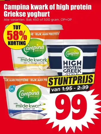 Geniet nu van heerlijke Campina kwark of high protein Griekse yoghurt in alle varianten, verkrijgbaar in bakken van 450 of 500 gram. Deze producten zijn rijk aan proteïne en perfect als gezonde snack of ontbijt. Kies uit magere, volle, milde kwark met een vleugje vanille of naturel volle Griekse yoghurt. Campina, een merk met een rijke historie sinds 1871, staat garant voor kwaliteit en smaak. Profiteer nu van een korting tot wel 58% op deze producten, maar wees er snel bij want OP=OP! Deze high protein Griekse yoghurt en milde kwark zijn planet proof en passen perfect in een gezonde levensstijl. Mis deze stunt prijs van slechts 99 cent niet!