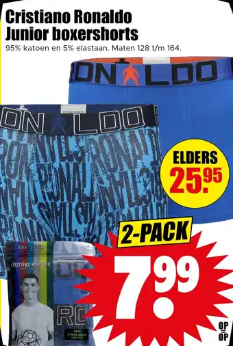De prijs van de Cristiano Ronaldo Junior boxershorts kan ook teruggevonden worden hierboven op de pagina, samen met de datum van wanneer de aanbieding beschikbaar is. Ook kun je de prijzen in de huidige Dirk folder of op de Dirk website controleren. De aanbiedingen verzekeren je van het kopen van de Dirk producten voor de laagste prijs.