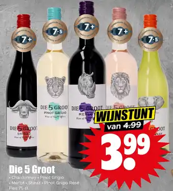Ontdek de heerlijke Die 5 Groot wijnen, aanbevolen door niemand minder dan E. Hamersma. Deze set bevat Chardonnay, Pinot Grigio, Merlot, Shiraz en Pinot Grigio Rosé uit Zuid-Afrika. Met een beoordeling van 7.5+ zijn deze wijnen van topkwaliteit en perfect voor elke gelegenheid. Geniet van de rijke smaken en aroma's van deze prachtige wijnen, verpakt in flessen van 75 cl. Profiteer nu van deze wijnenstunt en haal de Die 5 Groot collectie in huis voor slechts 4.99. Laat je verrassen door de unieke combinatie van smaken en geniet van een heerlijk glas wijn. Bestel nu en maak van elke gelegenheid een feest met Die 5 Groot!