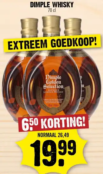 Dimple whisky is een heerlijke blended Scotch whisky, gecreëerd in Schotland. De Dimple Golden Selection is een whisky van uitstekende kwaliteit, met 40% vol en 700 ml. Deze whisky draagt de handtekening van de master blender als garantie voor de kwaliteit. Normaal kost deze fles 26,49, maar nu tijdelijk verkrijgbaar voor slechts 19,99. Profiteer van maar liefst 6,50 korting! Geniet van de rijke smaak en het karakter van deze whisky, die perfect is om van te genieten in goed gezelschap. Mis deze kans niet om deze hoogwaardige whisky voor een extreem lage prijs aan te schaffen. Bestel nu en ervaar de unieke smaak van Dimple whisky!