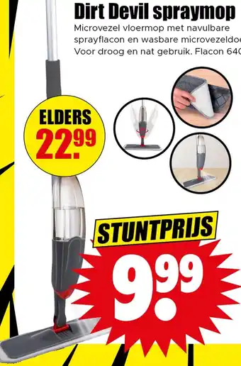 De Dirt Devil spraymop is een handige vloermop die zowel droog als nat gebruikt kan worden. De mop is voorzien van een navulbare sprayflacon met een inhoud van 640 ml, waardoor je gemakkelijk schoonmaakmiddel kunt verspreiden tijdens het schoonmaken. De wasbare microvezeldoek zorgt voor een grondige reiniging van verschillende vloertypes. Normaal gesproken kost deze handige spraymop elders €22.99, maar nu is hij verkrijgbaar voor een stuntprijs van slechts €9.99. Met de Dirt Devil spraymop wordt schoonmaken een fluitje van een cent en houd je jouw vloeren moeiteloos schoon en fris. Bestel hem vandaag nog en geniet van het gemak van deze praktische vloermop!