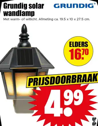 De prijs van de Grundig solar wandlamp kan ook teruggevonden worden hierboven op de pagina, samen met de datum van wanneer de aanbieding beschikbaar is. Ook kun je de prijzen in de huidige Dirk folder of op de Dirk website controleren. De aanbiedingen verzekeren je van het kopen van de Dirk producten voor de laagste prijs.