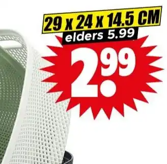 De prijs van de Opbergmand kan ook teruggevonden worden hierboven op de pagina, samen met de datum van wanneer de aanbieding beschikbaar is. Ook kun je de prijzen in de huidige Dirk folder of op de Dirk website controleren. De aanbiedingen verzekeren je van het kopen van de Dirk producten voor de laagste prijs.