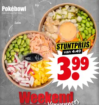 Geniet van een heerlijke Pokébowl met verse zalm of malse kip, helemaal naar jouw smaak samengesteld. Deze verrukkelijke bowl is gevuld met verse groenten, rijst en een smaakvolle dressing. Nu verkrijgbaar voor een STUNTPRIJS van slechts 4.49 per stuk. Verwen jezelf dit weekend met deze smaakvolle en gezonde maaltijdoptie. Of je nu kiest voor de zalm of de kip, elke hap zit boordevol smaak en voedingsstoffen. Bestel nu jouw Pokébowl en geniet van een culinair hoogstandje bij jou thuis. Deze aanbieding is alleen geldig in het weekend, dus wacht niet te lang en trakteer jezelf op deze heerlijke verwenners.