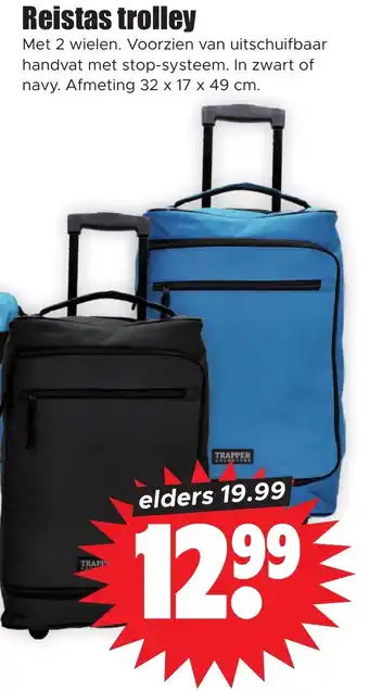 De prijs van de Reistas trolley 32X17X49CM kan ook teruggevonden worden hierboven op de pagina, samen met de datum van wanneer de aanbieding beschikbaar is. Ook kun je de prijzen in de huidige Dirk folder of op de Dirk website controleren. De aanbiedingen verzekeren je van het kopen van de Dirk producten voor de laagste prijs.