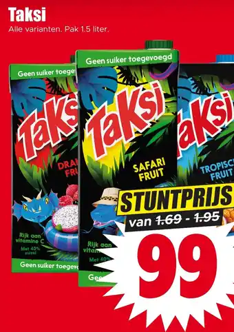Taksi is een verfrissende vruchtenlimonade in alle varianten, verpakt in handige pakken van 1.5 liter. Deze drank bevat geen toegevoegde suikers en is rijk aan vitamine C, met maar liefst 40% van de aanbevolen dagelijkse hoeveelheid. Geniet van de heerlijke smaken zoals Safari Fruit en Tropisch Fruit, zonder je zorgen te maken over toegevoegde suikers. Taksi is een perfecte dorstlesser voor elk moment van de dag. Profiteer nu van de stuntprijs van slechts 99 cent per pak. Verwen jezelf met de verfrissende smaak van Taksi en geef je lichaam een boost met vitamine C. Haal snel jouw favoriete variant in huis!